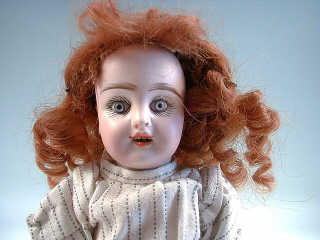 tête en biscuit marquée en creux " F.G.0 ", yeux fixes bleus, bouche ouverte sur une rangée de dents, corps en composition raide, perruque auburn, robe blanche rayée gris, chaussures et chaussettes peintes. H : 22 cm