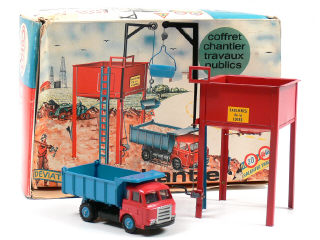 comprend une trémie 'SABLIERES de la LOIRE', avec sa potence & son godet, un SAVIEM JL20 benne de chantier, rouge, bleu & noir avec benne basculante à casquette & cale de boîte avec panneaux & barrières non détachés