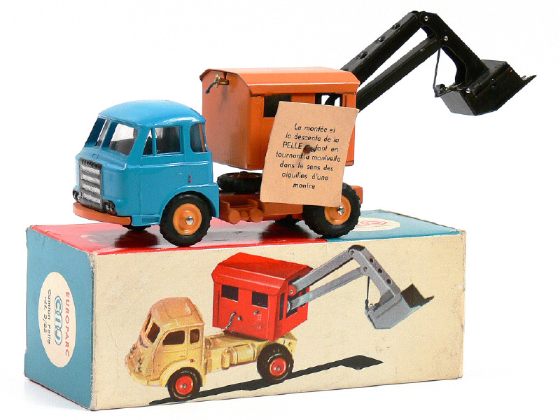jantes orange - boîte de la référence 3/82 première version avec illustration du RENAULT FAINEANT - avec rare petite étiquette de forme carrée accrochée à la manivelle indiquant le sens de déploiement du godet