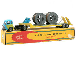 C.I.J. (FRANCE) 4/75 SAVIEM LRS Semi-remorque surbaissée porte-bobines de câble bleu & jaune vert