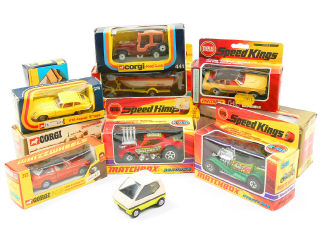 comprend : JAGUAR E, JEEP CJ5, FORD CORTINA GLX, FORD CAPRI MK II, MINISSIMA, BAZOOKA dragster, STREET ROAD dragster, CHIEFTAIN char, CENTURION char & SALADIN engin blindé - on y retrouve les marques : CORGI TOYS & MATCHBOX - 2 modèles en état 'B' & 3 boîtes en état 'c'