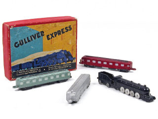 comprend : une locomotive à vapeur type 141 'MIKADO' avec tender & 3 voitures-voyageurs - longueur de l'ensemble 59 cm - fabrication en aluminium
