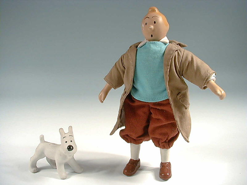 poupées en biscuit peint à la main avec habits en tissu - copyright HERGE - hauteur de TINTIN 25 cm - MILOU 8,5 cm - quelques petits manques de peinture - une patte de MILOU recollée