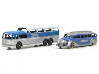 TOOTSIETOY (USA) GMC Autocar panoramique 'GREYHOUND' bleu, argent & blanc