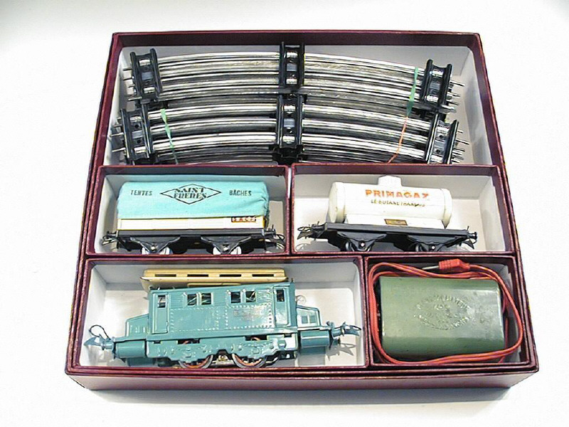 contient : Motrice deux essieux (C) retouches - manque tige de réglage - Wagon bâché 'SAINT-FRERES' (A) - Wagon citerne 'PRIMAGAZ' (B) - tranformateur - 12 rails courbes - coffret non d'origine
