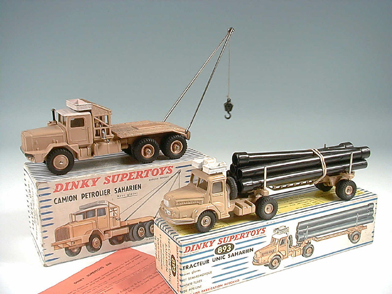 DINKY TOYS (FRANCE) 893 UNIC Saharien transport de pipe-lines (version avec jantes convexes & remorque ajourée) sable & blanc
