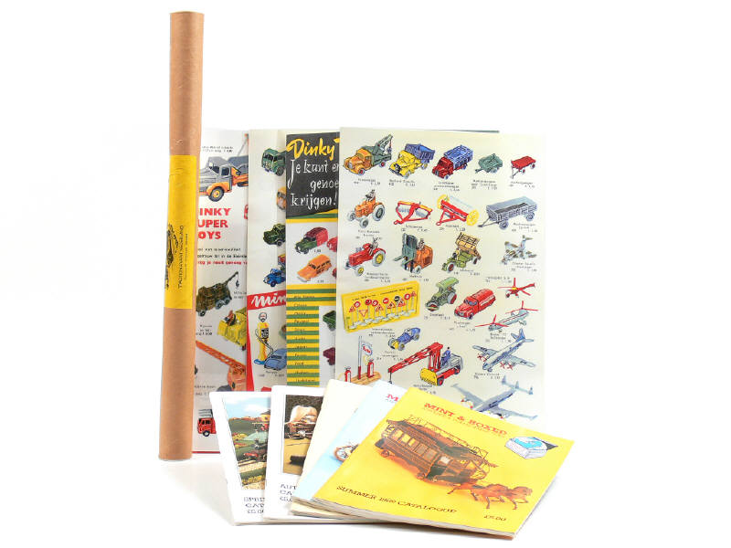 catalogues de la fin des années 80 du magasin 'MINT & BOXED' - calendriers de 1992 à 1993 représentant des DINKY TOYS & des DINKY MATCHBOX, panneaux publicitaires plastifiés avec VELCROS représentant des dessins libres de DINKY TOYS & posters représentant des CITRÖEN