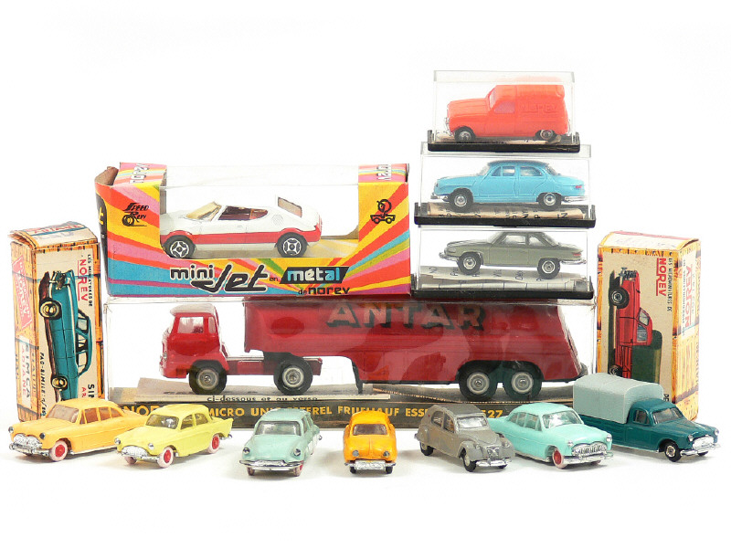 états de 'A' à 'C' - série MICRO MINIATURES - comprend : PEUGEOT 403 bâchée, CITROËN DS 19, CITROËN 2 CV AZ, PANHARD PL 17, PANHARD 24 CT, SIMCA ARONDE P60, SIMCA VERSAILLES, RENAULT DAUPHINE, RENAULT 4 fourgonnette, TRAPEZE BERTONE & UNIC semi-remorque 'ANTAR' - 7 modèles avec boîte dont un de la série MINIJET
