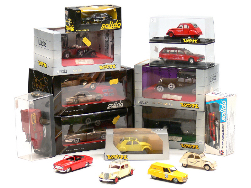 miniatures reproduisant les modèles : CITROËN, CADILLAC, PEUGEOT, FORD, FIAT, MERCEDES, JAGUAR, PORSCHE, TALBOT, ROLLS ROYCE & VOLKSWAGEN - on y retrouve les marques SOLIDO & VEREM - 4 voitures sans boîte - un modèle en état 'R' & une boîte en état 'd' - petits manques