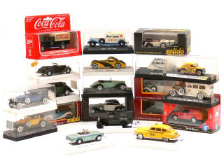 série 'AGE D'OR' - miniatures reproduisant les modèles : BUGATTI, CADILLAC, CHRYSLER, CITROËN, CORD, DELAGE, DELAYE, DUESENBERG, FACEL VEGA, FORD, MERCEDES, RANGE ROVER, RENAULT, ROLLS ROYCE & TALBOT - quelques carrosseries encrassées - une boîte en état 'D' - un modèle transformé