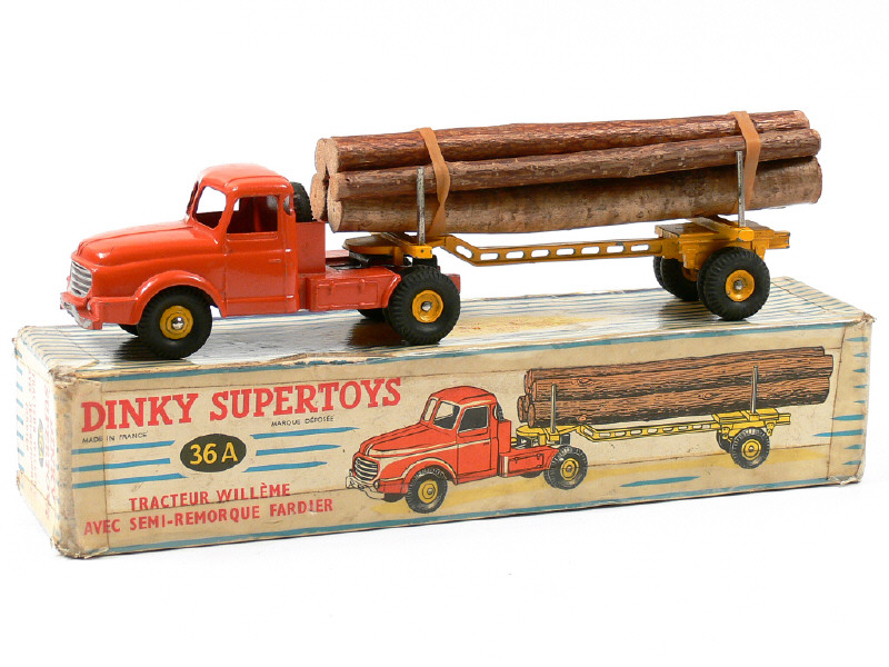 DINKY TOYS (FRANCE) 36A WILLEME Fardier (version avec jantes convexes & remorque ajourée) orange & jaune