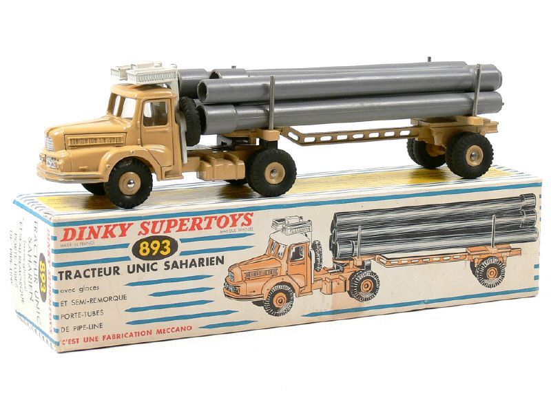 DINKY TOYS (FRANCE) 893 UNIC Saharien transport de pipe-lines (version avec jantes convexes & remorque ajourée) sable & blanc