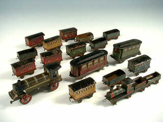 en tôle lthographiée - comprend deux locomotives, dix wagons voyageurs & six wagons tombereau - quelques manques - LOT SYMPATHIQUE !