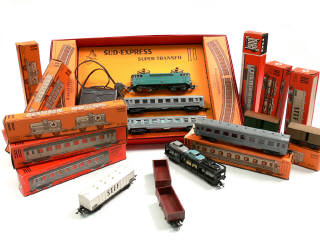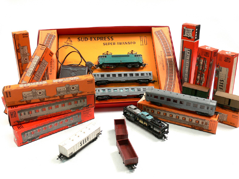 contient : une motrice électrique BB 9001 (détails de peinture ajoutés), 2 voitures de voyageurs de première classe, un transformateur de type 485, 2 boîtes de 4 rails courbes - on y joint un ensemble de 13 wagons de marchandise & 4 voitures de voyageurs - quelques modèles repeints ou avec détails de peinture ajoutés