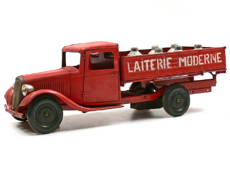 longueur 47 cm - fabrication de 1936-1939 - moteur à clef (fonctionne) - avec direction par le volant - phares électriques (manque ampoules), roue de secours, clef & 6 pots à lait en composition - manque une fixation arrière de châssis & bouchon de radiateur - 2 soudures de toit de cabine & de côté droit à revoir - quelques traces d'oxydation