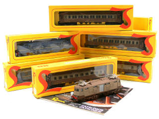 comprend : une motrice électrique italienne E424, une motrice électrique néerlandaise 1200, 3 voitures voyageurs italiennes & 2 fourgons à bagages - on y joint un catalogue de la marque de 1966-67