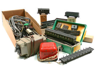 comprend : 5 wagons de marchandises de la marque SMCF (tous avec boîte), une voiture de voyageurs de la marque BUCO, un ensemble de rails & d'aiguillages de la marque JEP (dont 2 boîtes présentes) & 2 transformateurs dont un de la marque LR (en état 'D')