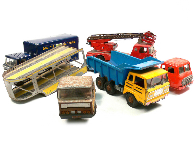états de 'D' à 'E' - comprend : un camion semi-remorque surbaissé, un camion-benne, BERNARD grande échelle de pompiers, un BERNARD fourgon 'SNCF' & un BERNARD semi-remorque porte-autos - avec manques & importantes traces d'oxydation sur certains modèles