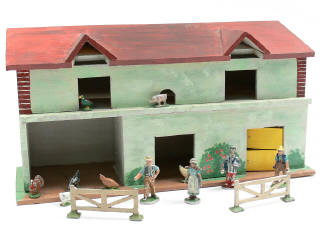 DIVERS Ferme en bois peint vert pâle, rouge foncé & marron