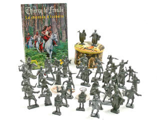 comprend : 41 figurines en plastique brut de la marque CAFE CAIFFA (petits manques), un album des éditions des 2 COQS D'OR 'LA CHANSON D'ISABELLE', 2 porte-clefs (en état 'C', avec traces d'oxydation) & une boîte en tôle représentant différentes scènes de la marque BS (un petit enfoncement sur le couvercle)