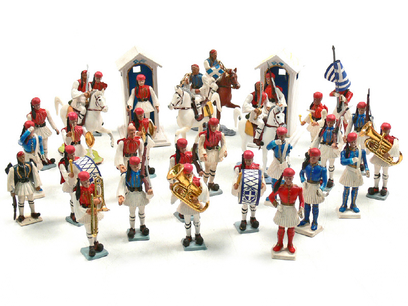 ATHENA (GRECE) Ensemble de 29 Evzones, 4 chevaux & 2 guérites