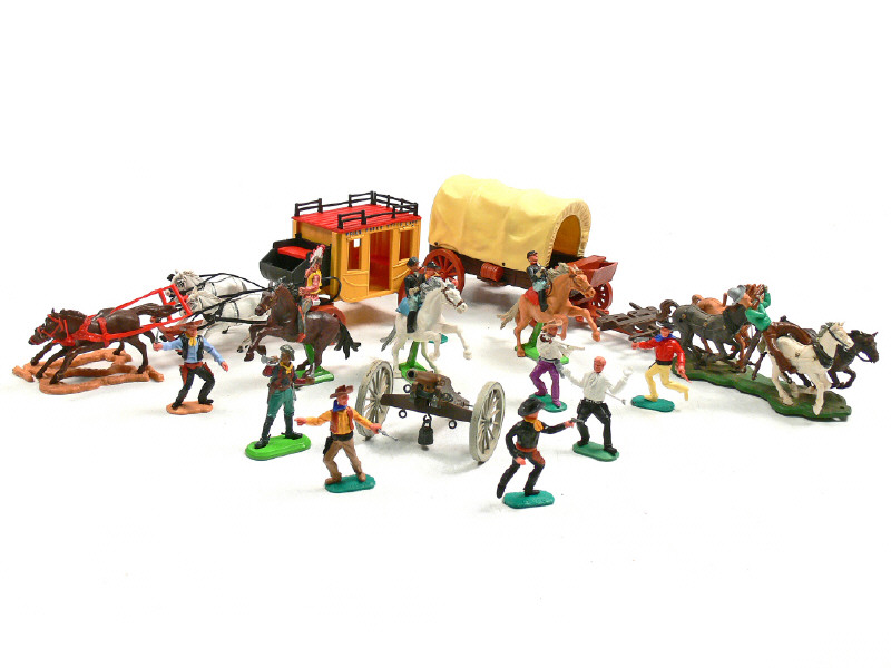 FIGURINES DIVERSES Ensemble de 16 figurines du Far-west, 2 diligences, 11 chevaux & un canon