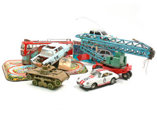 états de 'C' à 'F' - comprend : une PEUGEOT 205 GTI téléguidée, une grue sur roues, une PORSCHE 911, une PEUGEOT 404 téléguidée, un autocar, un tank 'TCHAD' & 2 circuits en tôle lithographiée - traces d'oxydation - on y retrouve les marques : JOUSTRA & FRANCE JOUETS
