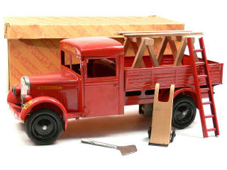 longueur 43 cm - version luxe avec phares électriques & moteur à clef (fonctionnent) - mentions 'CAMIONNAGE' sur le fronton de la cabine & 'TD' sur l'aile avant gauche - avec chargement comprenant 2 tréteaux, une échelle, 4 planches & un diable - notices collées au dos du couvercle - avec clef & papier de protection - un pneu très légèrement affaissé - boîte de la référence 6/50 avec pastille de couleur rouge - ETAT EXCEPTIONNEL !
