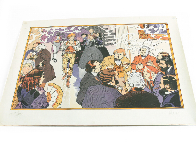 dimensions : 66 x 50,5 cm - tirée de la bande dessinée 'LES AVENTURES DE JIM CUTLASS' créée par Christian ROSSI - série limitée numérotée 2210/2600 exemplaires - quelques petits accrocs derrière la planche