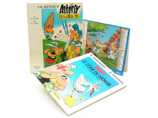 comprend ASTERIX LE GAULOIS (édition de 1961) & LE COUP DU MENHIR (l'album du film) - un petit accroc sur le bas d'une couverture - on y joint un almanach du facteur 2003 illustré sur le même thème