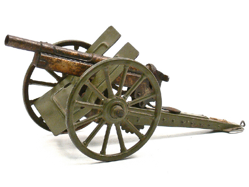 longueur 28,5 cm - avec molette d'orientation - réalisation d'avant-guerre - une trace de colle à l'arrière du canon - quelques parties oxydées