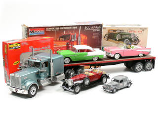 échelle 1/24ème - kit en métal - avec décoration du rallye de Monte-Carlo de 1966, socle de présentation & certificat de garantie - on y joint 2 maquettes en plastique de CHEVROLET BEL AIR coupé & cabriolet (petits manques)