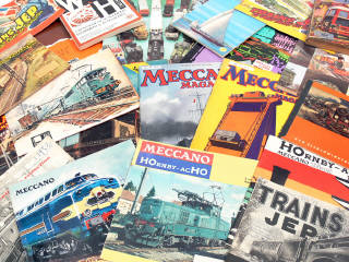 comprend notamment : 8 catalogues JEP, 14 catalogues HORNBY HO, un catalogue PIKO, un almanach du cheminot de 1953 (jamais utilisé), un catalogue W&H MODELS, un catalogue MODELL LOKOMOTIVEN, un calendrier de 1975, 8 catalogues MECCANO MAGAZINE (dont 3 de petit format) & 4 exemplaires D'ACTUALITES MECCANO