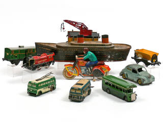 états de 'D' à 'F' - comprend : 2 autocars, une locomotive à vapeur type 020, 3 wagons de marchandises, une remorque agricole, une moto, un autobus, une RENAULT 4 CV 'POSTES' & un paquebot 'NORMANDIE ' faisant office de boîte à biscuit - on y retrouve notamment les marques : HORNBY, JOUSTRA, MINIC, CIJ & HIRSCHIELD FRERES - traces d'oxydation sur certains éléments