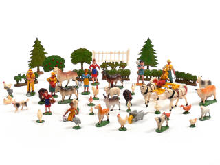 états de 'B' à 'C' - comprend : 9 personnages, 32 animaux, 6 haies, 4 arbres, une brouette, une barrière & une faneuse hippomobile - petits manques - 2 éléments de marque indéterminée