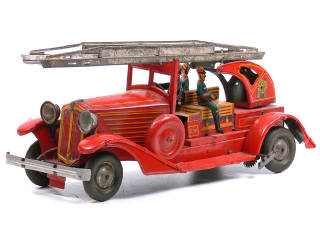 longueur 44 cm - version avec roues à pneus - moteur à ressort (fonctionne) - manque dévidoirs latéraux - retouches sur les ailes & les roues de secours - petites traces d'oxydation - parties nickelées ternies
