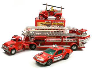 états de 'A' à 'D' - comprend 2 camions semi-remorques grande échelle de pompiers américains, une FORD T échelle de pompiers & une ALPINE A310 'FIRE CHIEF' - on y retrouve les marques : TONKA, ERTL, JOUSTRA & NEW BRIGHT - un modèle avec boîte - quelques petits manques & traces d'oxydation