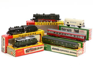 FLEISCHMANN 'HO' (ALLEMAGNE) Ensemble de 2 locomotives, une motrice, 2 voitures de voyageurs & un wagon