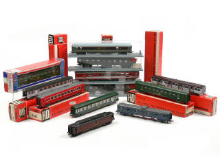 JOUEF 'HO' (FRANCE) Ensemble de 9 voitures de voyageurs, 2 fourgons à bagages & une voiture-cinéma