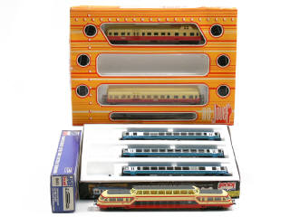 contient une voiture de 1ère & 2ème classe & 14 rails courbes (manque 2 éléments roulants dont la motrice) - on y joint une voiture de seconde classe en état 'c' de la marque FLEISCHMANN
