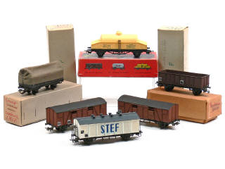 comprend : 2 wagons couverts, un wagon-tombereau, un wagon-frigorifique 'STEF', un wagon-tombereau bâché (doute sur l'authenticité de la bâche) & un wagon-citerne isotherme 'LES MESSAGERIES LAITIERES' - 2 modèles sans boîte & un autre avec boîte non conforme