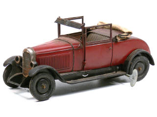 longueur 41 cm - moteur à clef (à revoir) -avec clef - échelle 1/10ème - fabriquée de 1928 à 1932 - manque volant, bouchon de radiateur, tringle de fixation avant de capote, un écrou de fixation d'armature, plaque minéralogique, roue de secours & son support - traces d'oxydation essentiellement sur le moteur & l'axe de roues arrière