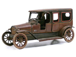 longueur 35,5 cm - fabrication du début de siècle - moteur à ressort (fonctionne) - avec direction & portes ouvrantes - manque 3 portières, vitre de pare-brise, une partie de poignée & phares - traces d'oxydation - moyeux de roues à revoir
