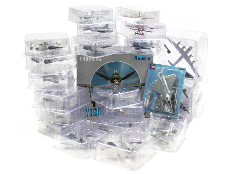 on y retrouve les appareils : BELL BOE OSPREY, E-2 CJ GRUMMAN, BOEING B-52, BOEING B-29, HAWKER TYPHOON, KAWASAKI KI-45 TORYU, MIG-23, MESSERSCHMITT ME-109, FOKKER Dr.1, HAWKER HURRICANE MK II, FOCKE-WULF FW 190, EFA 2000, AERMACCHI MB339, TUPOLEV TU160, SR-71 BLACKBIRD, F-14 TOMCAT, MESSERSCHMITT ME-262, F-117 STEALTH, A-1H SKYRAIDER, KFIR, MIG-15, SPITFIRE MK II, POLIKARPOV I-16, F4U CORSAIR & RAFALE - on y joint un FOCKE-WULF FW190 de la marque ARMOUR COLLECTION à l'échelle 1/48ème