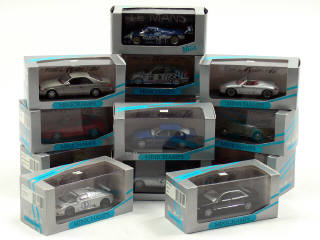miniatures reproduisant les modèles : AUDI, BMW, BUGATTI, FERRARI, MERCEDES, PORSCHE, SAUBER & VOLKSWAGEN - une boîte en état 'c'
