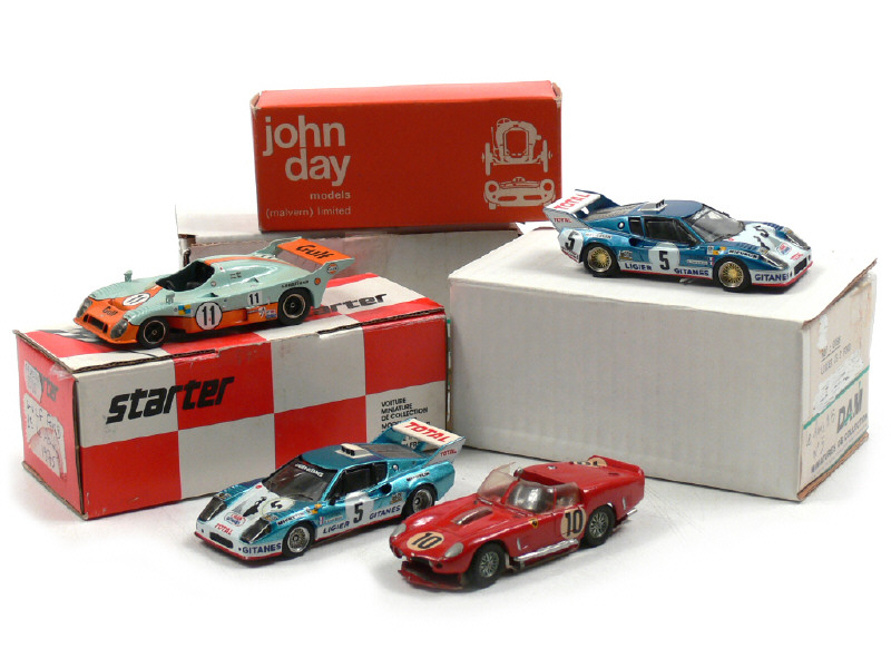 états de 'B' à 'C' - miniatures reproduisant les modèles : FERRARI (à recoller), LIGIER & MIRAGE - on y retrouve les marques : DAM, JOHN DAY & STARTER - petits manques - les boîtes sont en état 'b'
