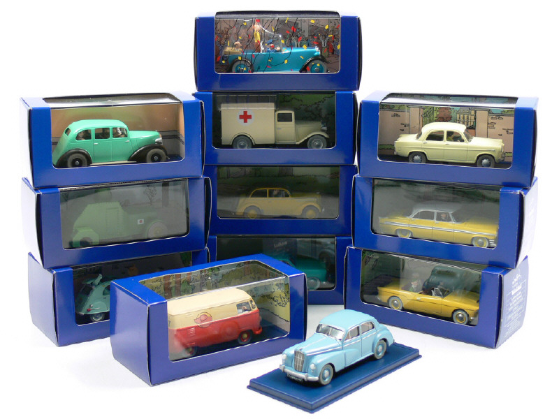collection 'EN VOITURE TINTIN' - comprend les références : 16, 19, 32 (manque un rétroviseur), 33, 37, 39, 47, 49, 52, 56, 58 & 60 - sous boîtes-vitrines
