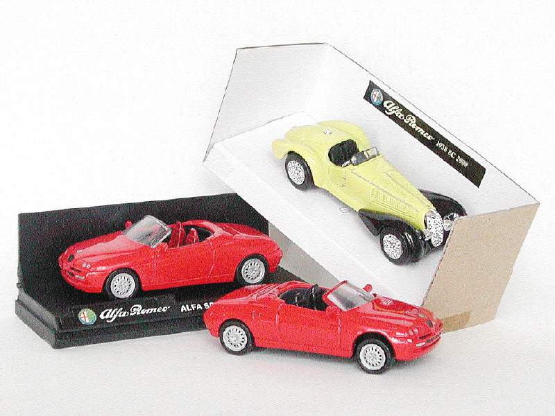 comprend : ALFA ROMEO Spider (sièges rouges) de 1996, ALFA ROMEO 8C 2900 Roadster de 1938 & ALFA ROMEO Spider de 1996 (sièges noirs, avec un panneau, un lampadaire et 2 personnages)