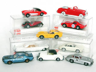 échelle HO - miniatures reproduisant les modèles : PONTIAC, CHEVROLET, FERRARI, ROLLS ROYCE, MERCEDES, MORGAN, CADILLAC & VOLKSWAGEN - on y retrouve les marques PRALINE & BUSH - 4 véhicules sans boîte