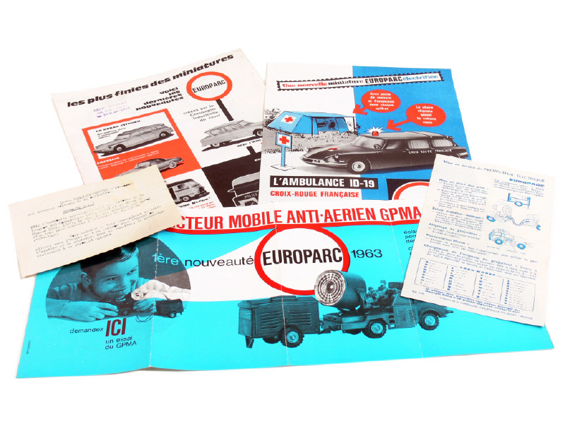 présente les nouveautés : CITRÖEN ID 19 ambulance, RENAULT militaire avec projecteur & groupe électrogène & les derniers modèles de la série EUROPARC - les notices concernent la caravane-camping & le projecteur électrique